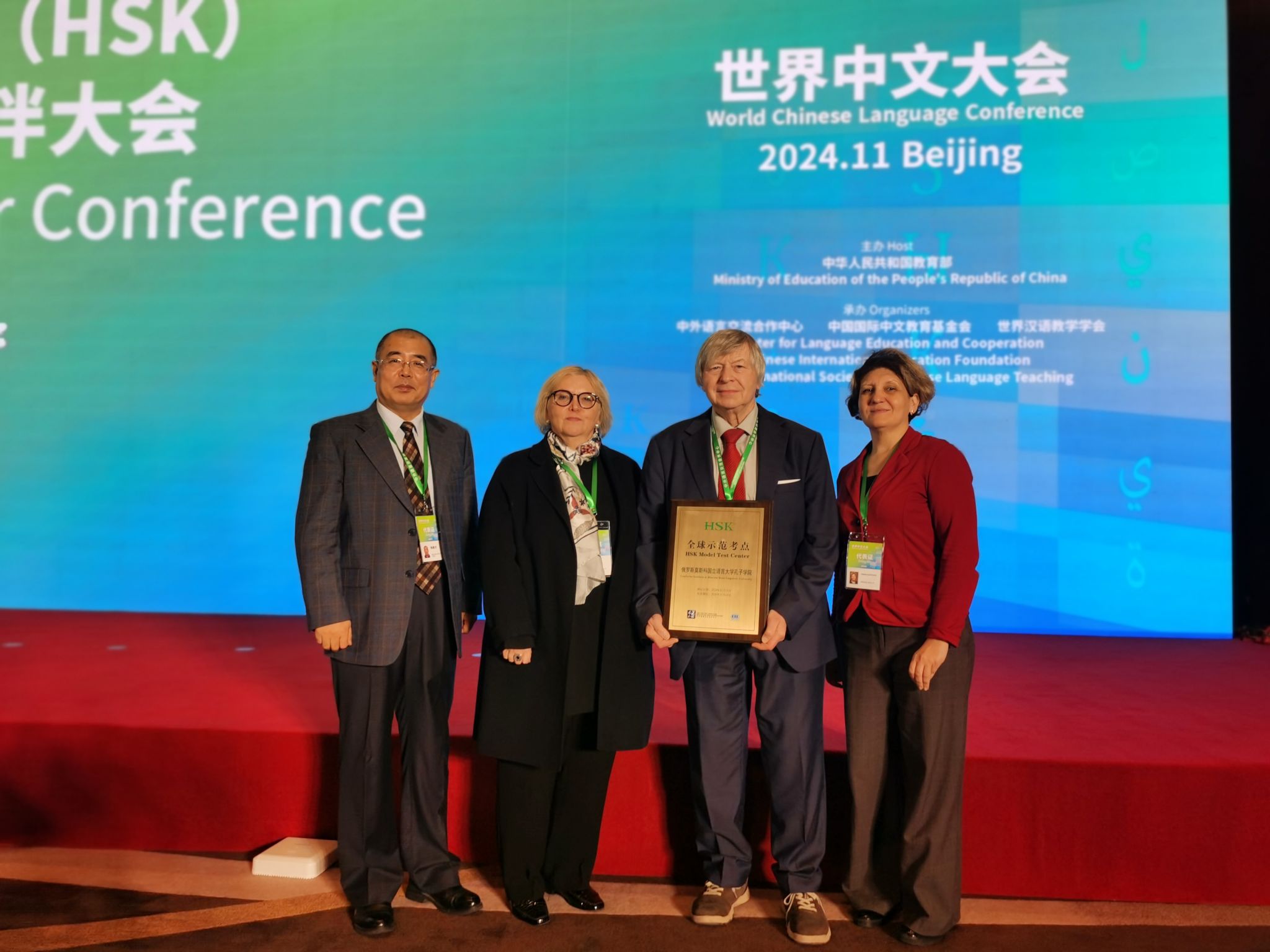 From Nov. 15 to 17, 2024, the 2024 World Chinese Language Conference was held. Jia Wenjian, President of BFSU, and Liu Xinlu, Vice President of BFSU, were invited to attend. Jia attended the Symposium Commemorating the 20th Anniversary of Confucius Institutes and delivered a speech. He also gave the keynote speech at the 2024 World Language Education Forum organized by BFSU. Liu attended and chaired the 2024 China-GCC Language and Culture Forum. Twenty-three Chinese and international students from BFSU gave a choral performance at the opening ceremony. BFSU co-hosted CIs, individuals from BFSU’s co-hosted CIs, and partner institutions received multiple awards at the conference. FICB and CIM were awarded the title of 2024 Outstanding HSK&CTC Test Center. CIMSLU and ELTE-CI received the title of Model Test Center. Ferenc Hudecz, member of ELTE-CI Board; Professor Andrzej Kapiszewski from Jagiellonian University; Professor Federico Masini, Chair of CISUR Board and Italian Director of CISUR; and Professor Richard Trappl, Austrian Director of CIUV, received the Brilliance of CI appreciation plaques.