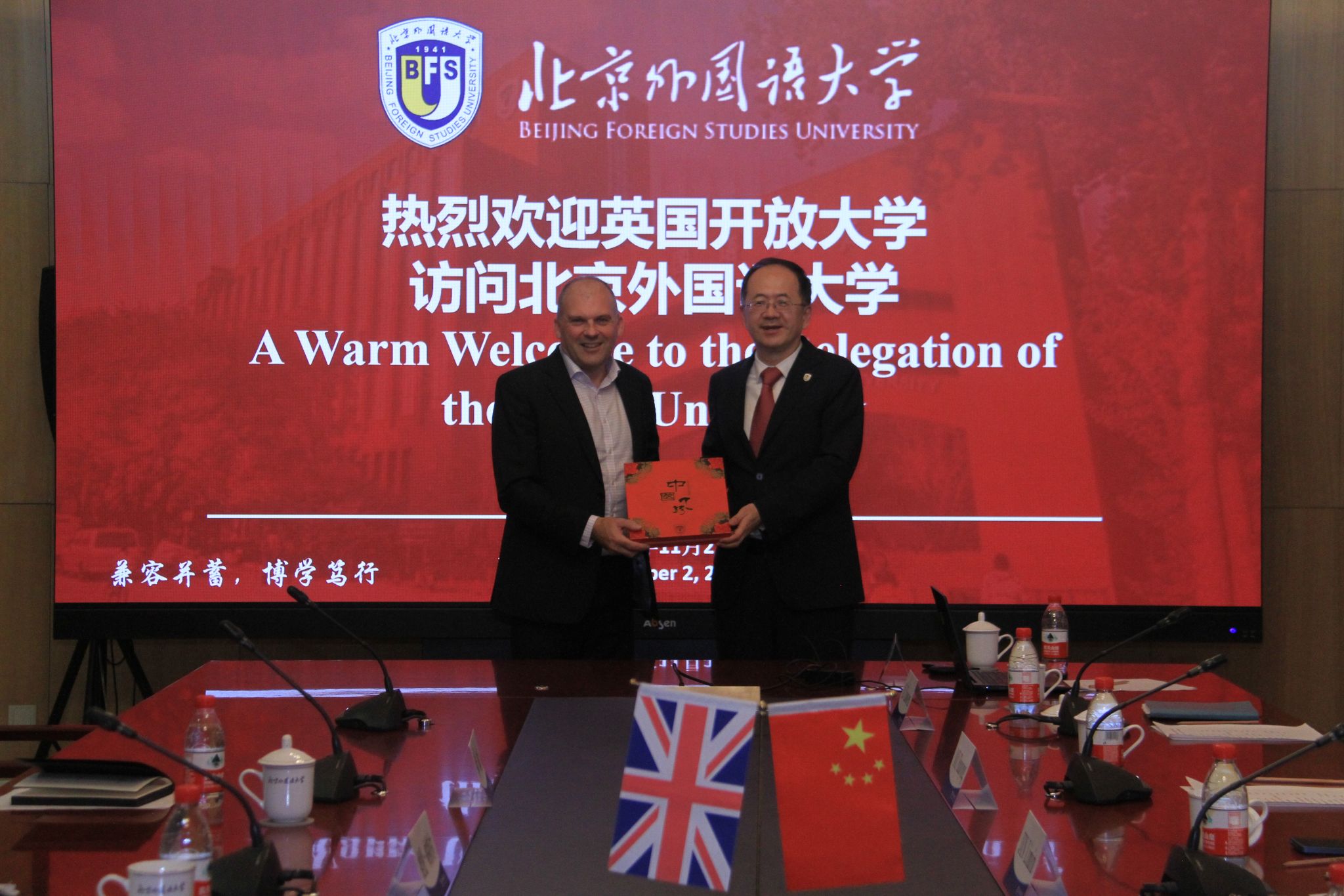 On Nov. 2, 2023, Kevin Shakesheff, Pro-Vice Chancellor of the Open University, visited BFSU. Jia Wenjian, then Vice President of BFSU, met with the delegation.