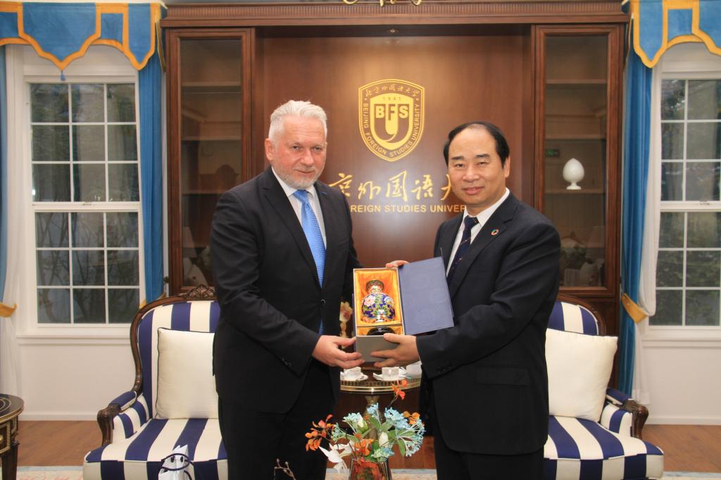 On Nov. 3, 2023, Dr. Borhy Lászlo, Rector of Eötvös Loránd University, led a delegation to visit BFSU. Wang Dinghua, Chairman of the University Council of BFSU, met with the delegation.