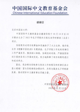 On Nov. 13, 2023, CIEF sent a letter of gratitude to BFSU, expressing their appreciation for BFSU’s co-hosting of the 2023 Local CI Directors’ Workshop in China.
