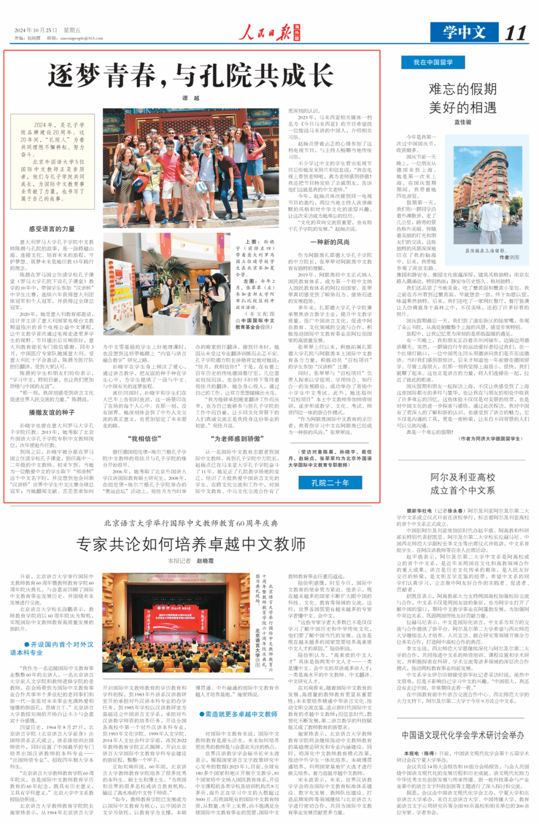 On Oct. 25, the overseas edition of People’s Daily published an article titled Chasing Dreams of Youth, Growing Together with the Confucius Institute (20 Years of CIs), highlighting the work of five dedicated international Chinese language teachers from BFSU—Chen Chen, Sun Xiaoyu, Xun Jiayue, Zhao Wanzhen, and Zhang Cuicui—at CIs abroad. Divided into five sections—Feeling the Power of Language, Sowing the Seeds of Friendship, I Believe in You, Proud of Our Teachers, and A New Trend—the article recounts their experiences and contributions to international Chinese language education over the past 20 years, showcasing the dedication and achievements of BFSU’s teachers.