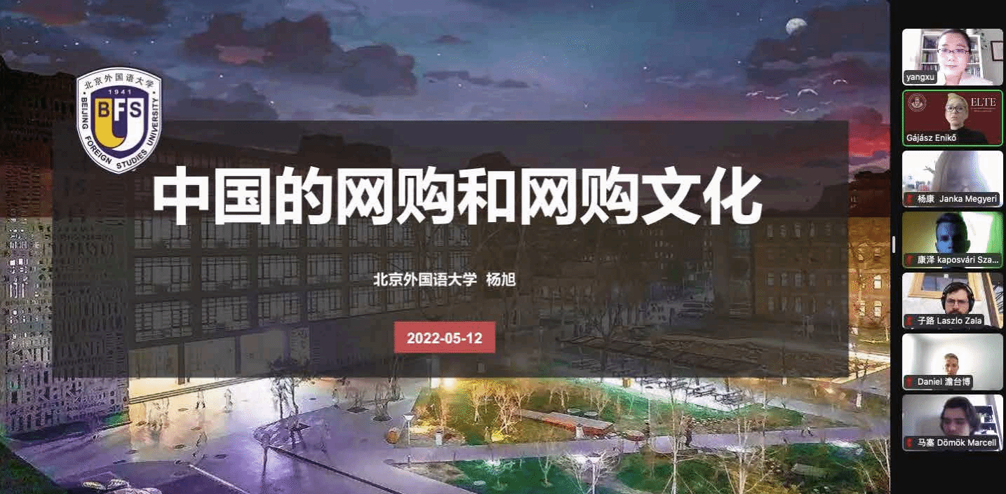 On May 6 and 12, 2022, coordinated by the BFSU Office of Confucius Institutes, the BFSU School of Chinese Language and Literature hosted two online cultural talks for the Chinese language students from ELTE. Liang Dongmei and Yang Xu from the BFSU School of Chinese Language and Literature gave talks on “Marriage in Contemporary China” and “Online Shopping and Online Shopping Culture in Contemporary China,” respectively.
